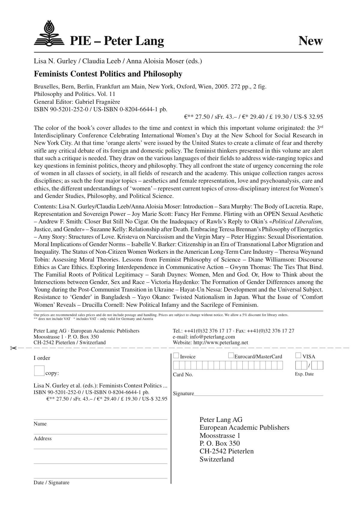 Text on back cover: The color of the book's cover alludes to the time and context in which this important volume originated: the 3rd Interdisciplinary Conference Celebrating International Women's Day at the New School for Social Research in New York City. At that time 'orange alerts' were issued by the United States to create a climate of fear and thereby stifle any critical debate of its foreign and domestic policy. The feminist thinkers presented in this volume are alert that such a critique is needed. They draw on the various languages of their fields to address wide-ranging topics and key questions in feminist politics, theory and philosophy. They all confront the state of urgency concerning the role of women in all classes of society, in all fields of research and the academy. This unique collection ranges across disciplines; as such the four major topics - aesthetics and female representation, love and psychoanalysis, care and ethics, the different understandings of 'women' - represent current topics of cross-disciplinary interest for Women's and Gender Studies, Philosophy, and Political Science.